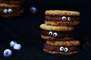 Oder wie wäre es mit einem Eis-Sandwich mit Gespensteraugen. Die Zuckeraugen sind mit Zuckerguss und Speisefarbe einfach herzustellen. Zwischen zwei Keksen eine Kugel Schokoeis geben und die Augen platzieren.
