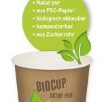 BIOCUP „ZUCKERROHR“ sind neue Qualitäts-Becher aus FSC-zertifiziertem Papier, das per nachhaltiger Forstwirtschaft gewonnen wird. Die Becher werden mit geringem Energieaufwand produziert und sind biologisch abbaubar. Nach Gebrauch zersetzen sie sich bei der Entsorgung schnell und sind sogar kompostierbar. Innen sind die BIOCUPs mit dem natürlichen Rohstoff „Zuckerrohr“ beschichtet. Der Clou dabei: Diese BIOCUP-Beschichtung besteht aus Zuckerrohrfasern, die nach der Zuckergewinnung als Reststoff anfallen. Im Gegensatz zu Biobechern aus Mais, wird hier kein Lebensmittel sondern ein Abfallprodukt sinnvoll eingesetzt. Die BIOCUPs gibt es in 5 verschiedenen Größen von 120 ml bis 500 ml. Alle Varianten sind individuell bedruckbar.