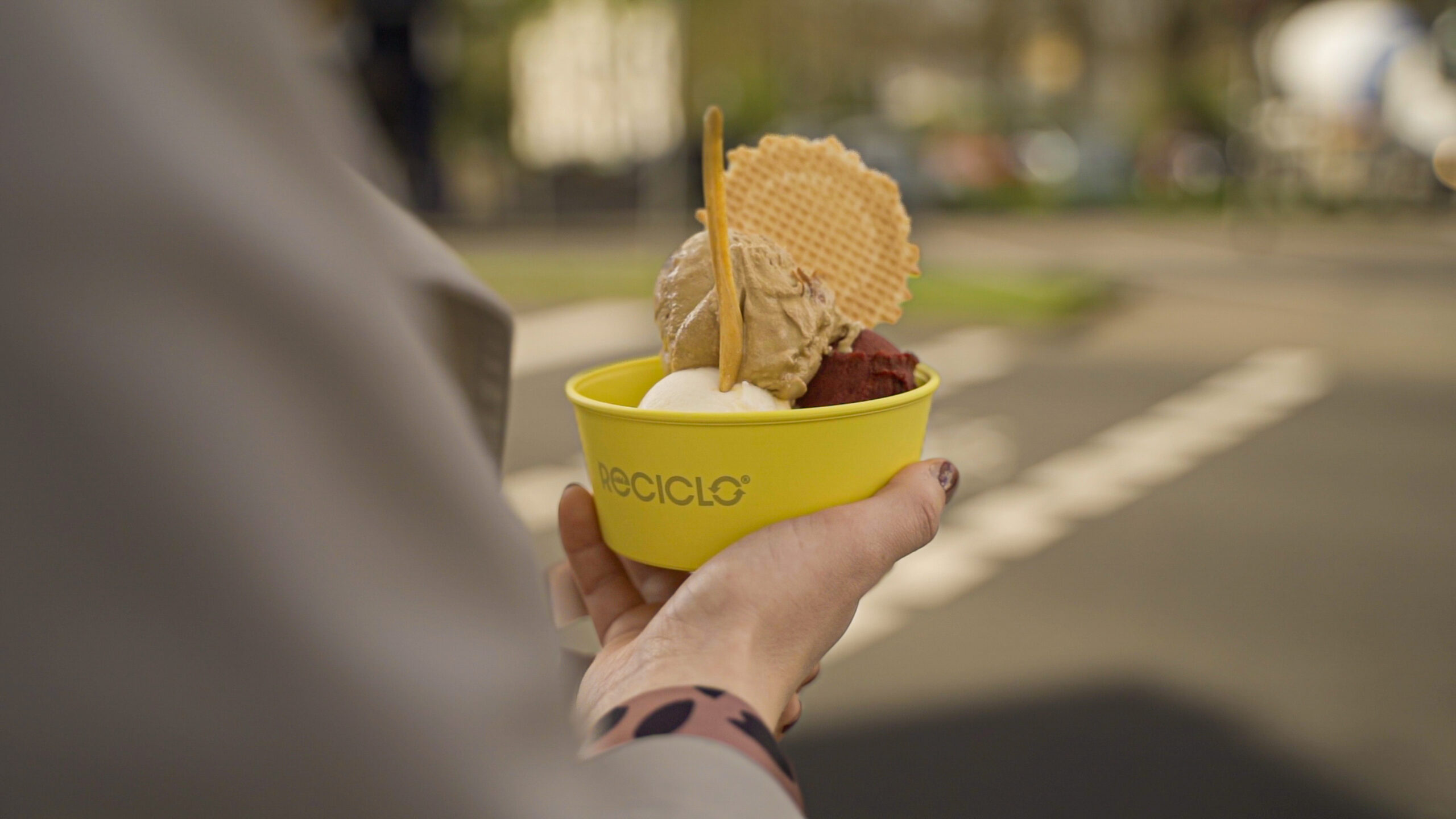 Eis im gelben ReCiclo Mehrwegeisbecher für To-Go