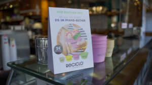 Aufsteller ReCiclo auf der Theke für Eis im Pfandbecher
