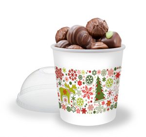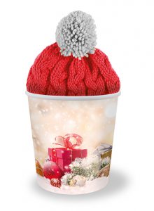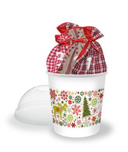 Eine winterliche oder weihnachtliche Zugabe machen das festliche Konfiserie-Angebot dann zur aufmerksamkeitsstarken Weihnachtsüberraschung. Beeindrucken Sie in der Adventszeit mit einer tollen Geschenkidee. Je nach Füllgut und Gestaltung, erzielen die Becher ganz sicher viel Aufmerksamkeit. Und Sie können ganz vielfältige und kreative Ideen realisieren, die zusätzliches Geschäftspotenzial eröffnen. Denken Sie zum Beispiel an ein vorweihnachtliches Kundengeschenk, das Sie für Unternehmen produzieren. Ihrer Kreativität sind keine Grenzen gesetzt. Sie haben die Wahl aus drei Motivbechern in den Größen 625 ml und 360 ml mit passenden Domdeckeln.